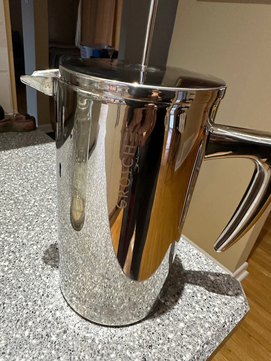 The first French press that I bought was a glass Bodum, and after a few years, it did chip, which is why I was adamant about my next press being unbreakable, which led me to the Dublin. The press is well designed, it comes with two spare mesh filters, it is sleek, stunning and very easy to clean. Because it is insulated it will keep the coffee hot, and the exterior does not get too hot. What I love most is that it has no plastic parts that come in contact with hot water. I love their mandate for corporate social responsibility, but this isn't just a statement of theirs. They are B Certified (I checked the B Corp directory and verified that Grosche is listed confirming that they are a Canadian company "Using Business as a Force for Good"), so I also love that they are a Canadian company. It also pours so nicely! The reason I didn't give it 5 stars is because the press should include internal volume graduations marking ¼ L, ½ L, ¾ L, and 1 L. To me that is a basic feature because the ratio of coffee grind to water is key, and consequently a non-negotiable. I shouldn't have to measure out the amount of water for my electric kettle. Please make this a part of the redesign. :) The last minor comment I will offer is that I did a test with soapy hands and held this unit, and found it hard to hold, so a future design should consider some type of a knurl on the handle, but I can understand that it would change the beautiful sleek look. Thanks for a great product, this will last me for decades and it is one that I would highly recommend to anyone.
