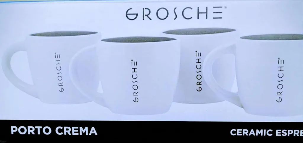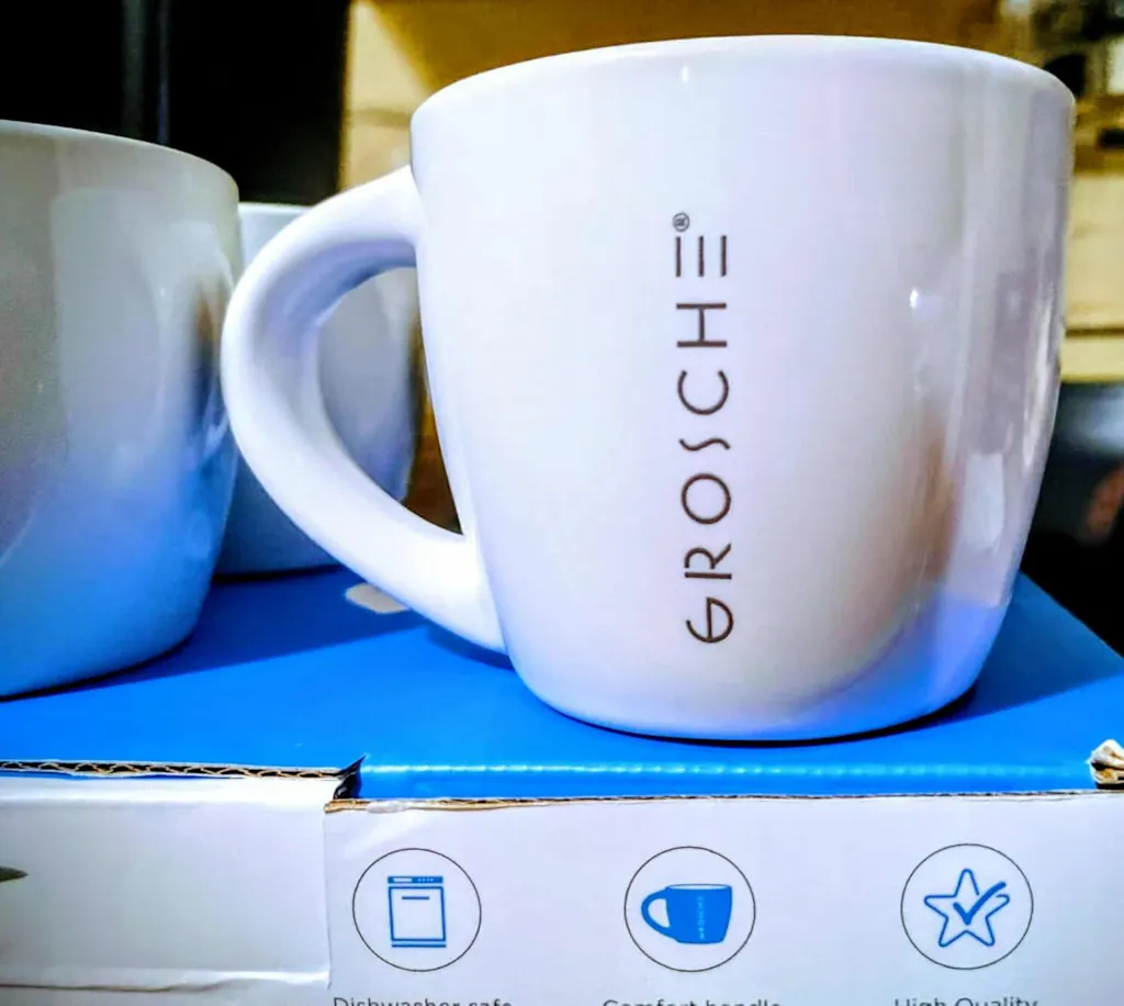 - Vertical GROSCHE lettering adds subtle café-bar style